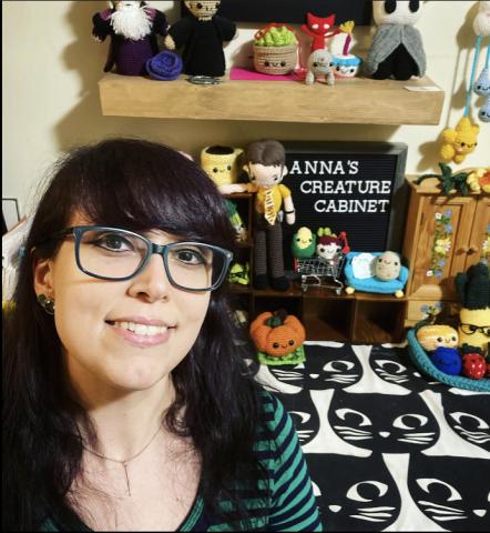 Anna Hall is a fiber artist specializing in crochet Amigurumi, hats, scarves, and more. Anna is inspired by her tiny curio cabinet, which is the centerpiece of her art and what she uses to display her Amigurumi creatures. Anna is also a crochet pattern tester and recently started writing her own patterns, which can be found on her website.