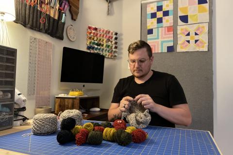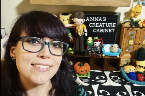 Anna Hall is a fiber artist specializing in crochet Amigurumi, hats, scarves, and more. Anna is inspired by her tiny curio cabinet, which is the centerpiece of her art and what she uses to display her Amigurumi creatures. Anna is also a crochet pattern tester and recently started writing her own patterns, which can be found on her website.
