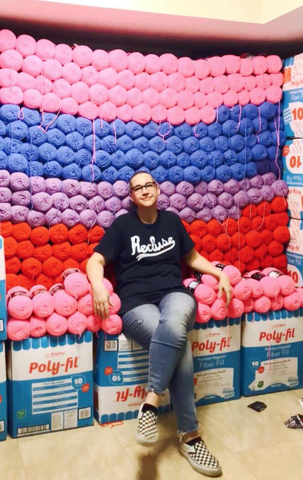 Since each of the artists used large quantities of yarn for their installs, we wanted to do a special series of Happy Place blog posts to dive into how each of them stored and organized their yarn. Read on for our CYC AIR Happy Place with Hannah Busekrus of Hanasaurusrex and /h//s/r/ textiles! Hannah is a fiber artist, yarn bomber, illustrator and all around awesome person who was part of our Humans That Yarn campaign!