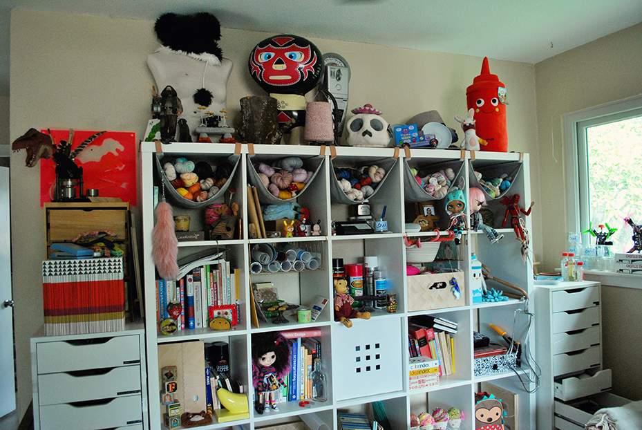I used any space I could find! Some of my nice hand-dyed yarns are in pretty baskets or in little shelf "hammocks" from Ikea that fit their Kallax shelf system, but I notoriously have more yarn than space, like always... so all the craft acrylic I use for yarn bombing and quick projects live in lawn size garbage bags in the spare room. There are boxes here and there with yarn shipments still in them. I use a lot of Knit Picks Wool of the Andes, so it's everywhere. I was using an old vintage dresser to organize it by color, but then I got busy with projects/work and ended up using a lot of it. I bought more, but it hasn't made it back into an organized state yet.