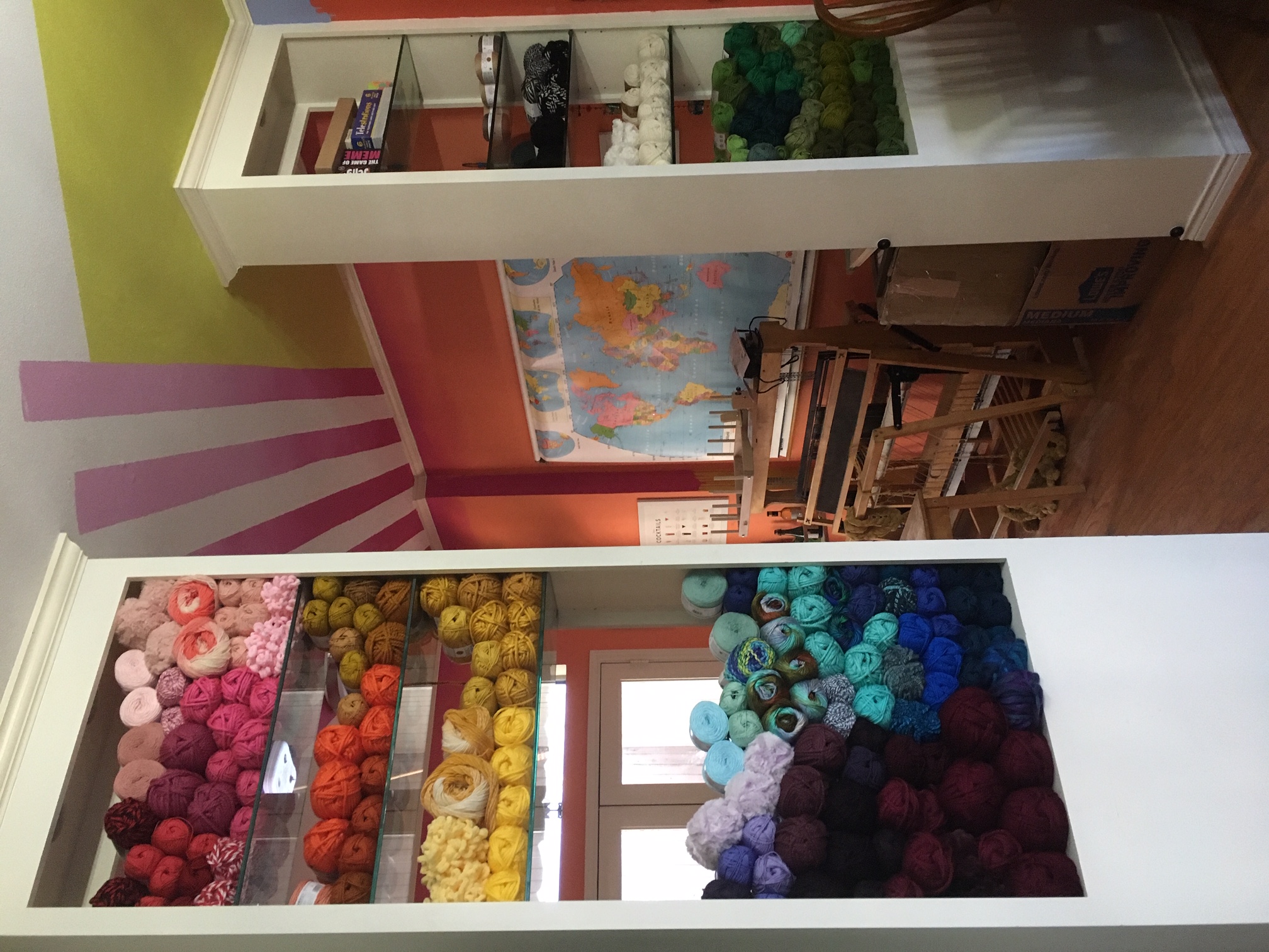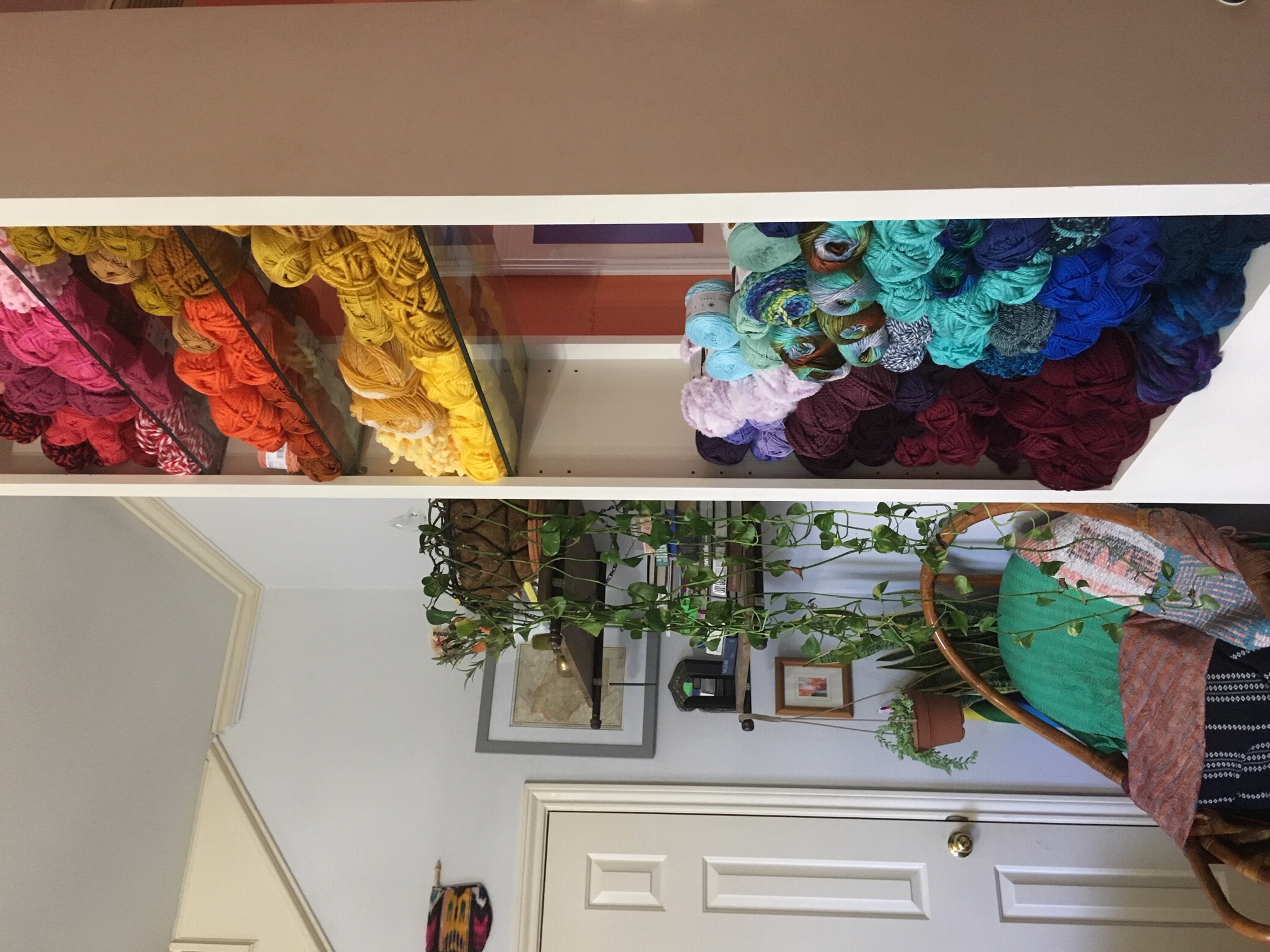 I figured this system out after the yarn came. It was far too much material to put anywhere except out in the open. I needed to pull from it every time I worked, so it only made sense to go in my work space. While I worked, my loom was in the dining area. We moved the kitchen table outside! The yarn was on the bookshelves that separate the dining area from the living room. It was all on top of each other, but I think it was creatively cozy!