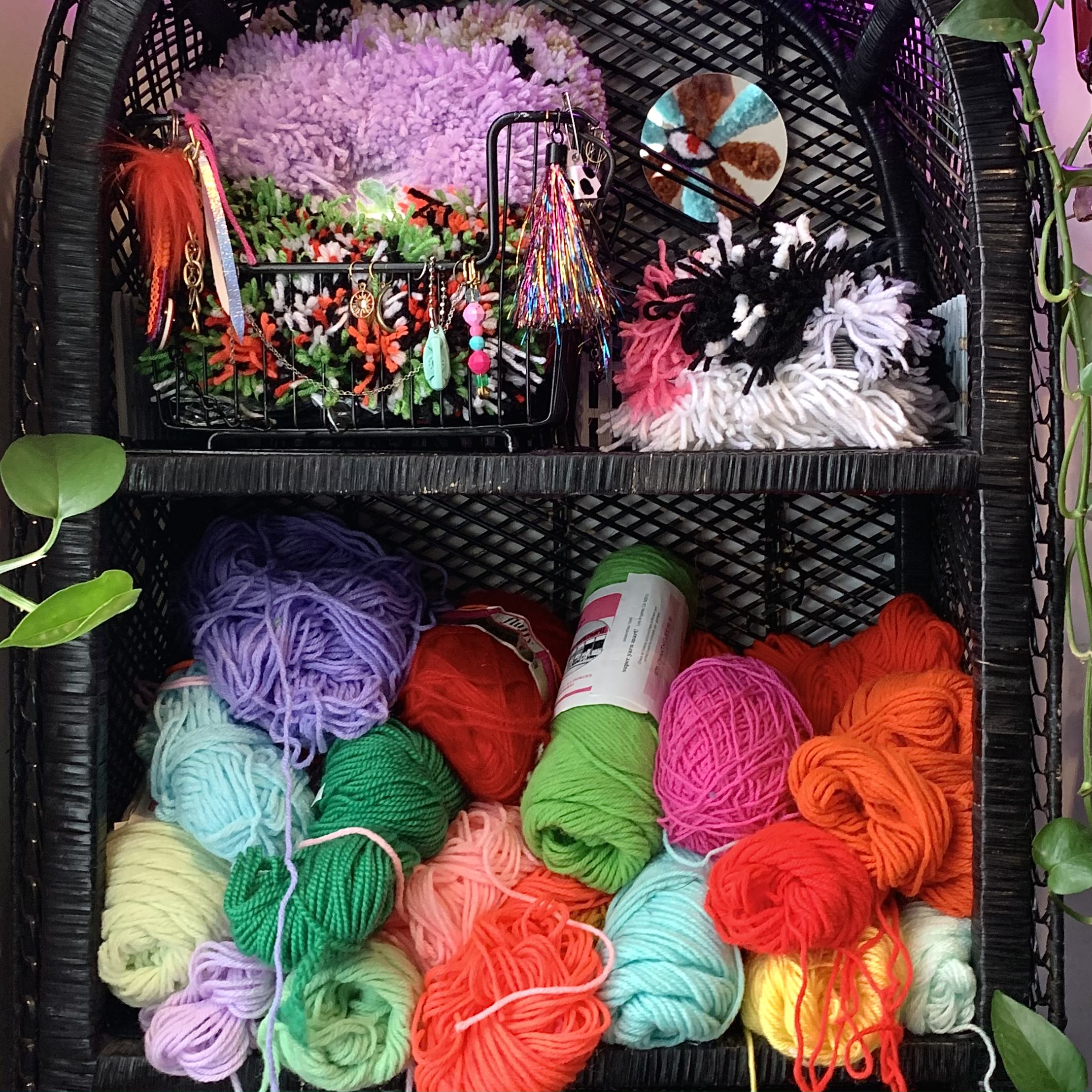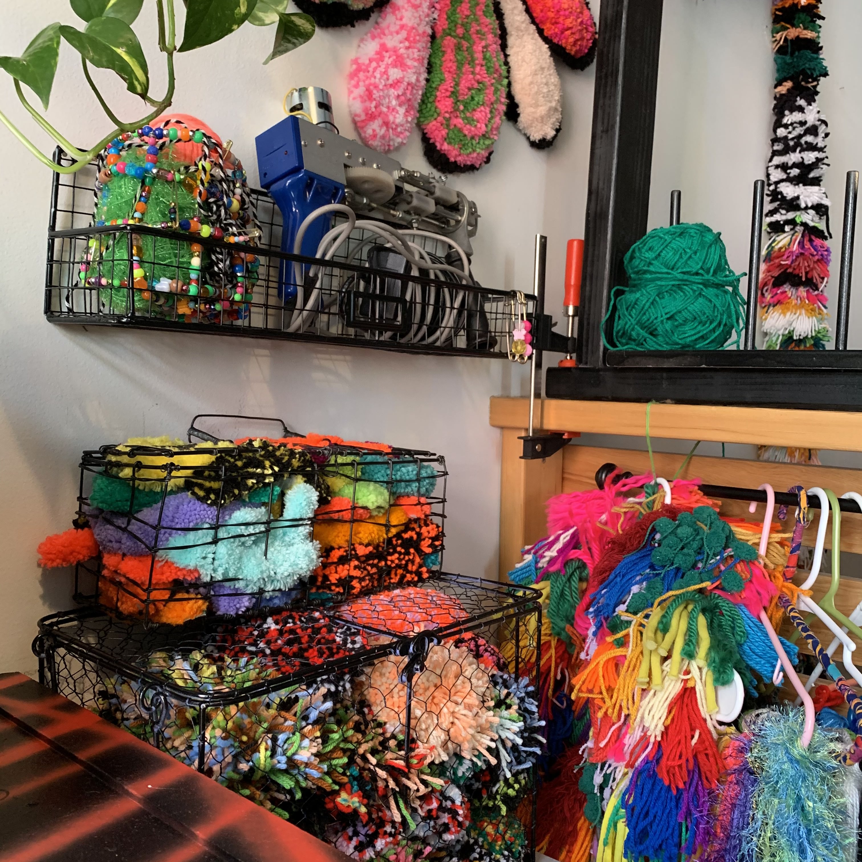 Storing yarn takes up a lot of space! I find it relaxing to organize my materials, but I noticed I was spending too much energy putting colors back. I’ve since taken a more relaxed approach to storing my yarn in multiple places to free space in my studio.