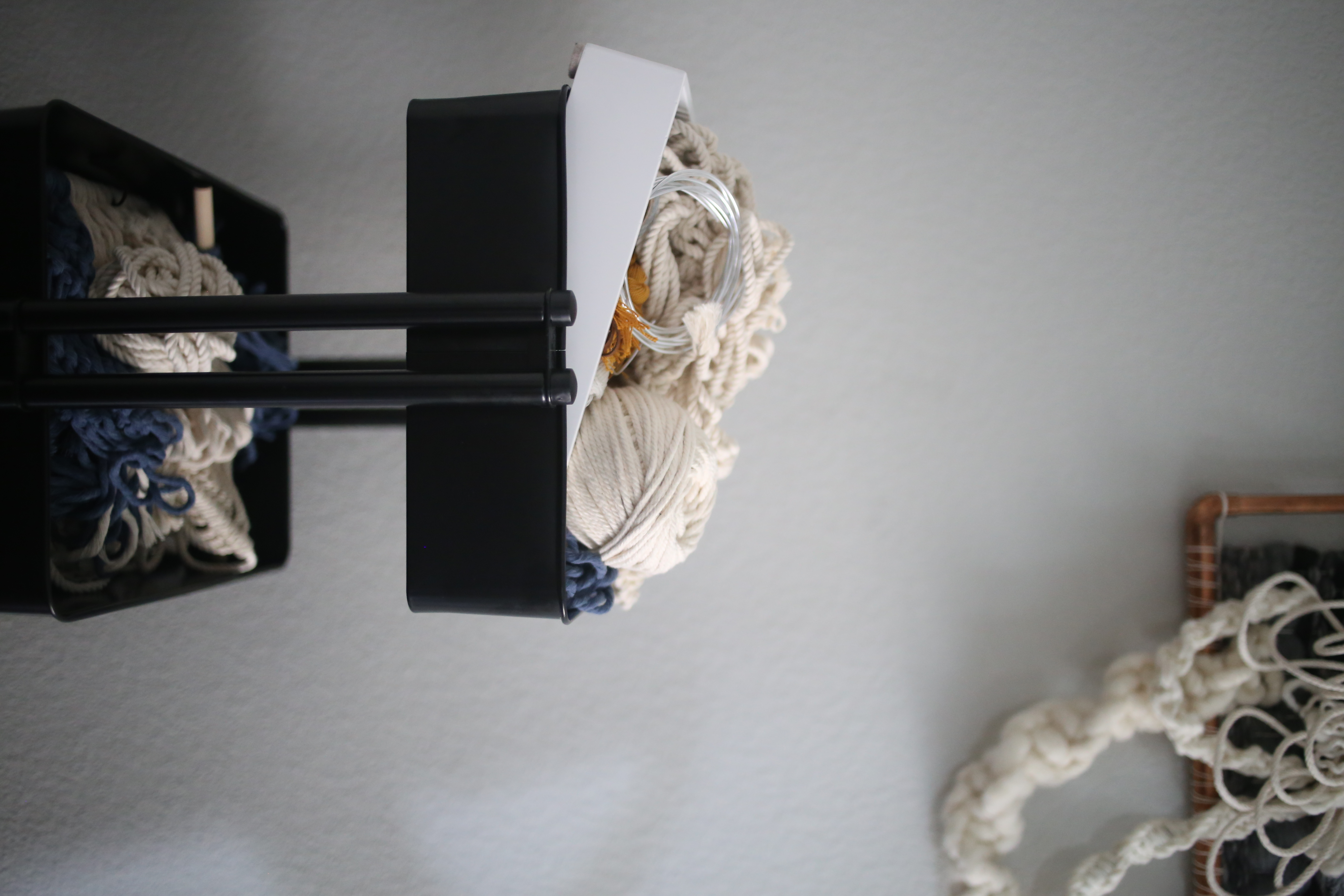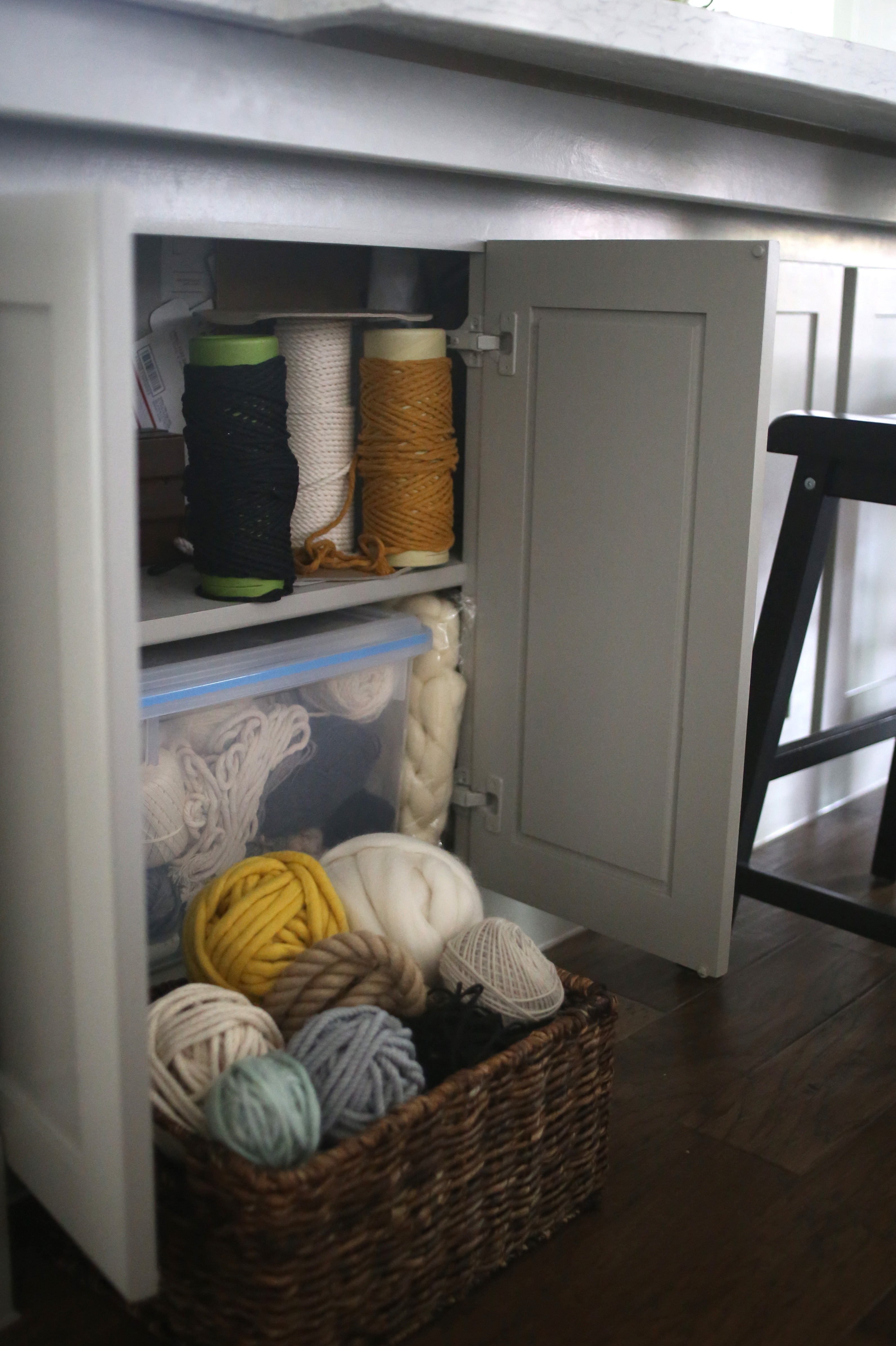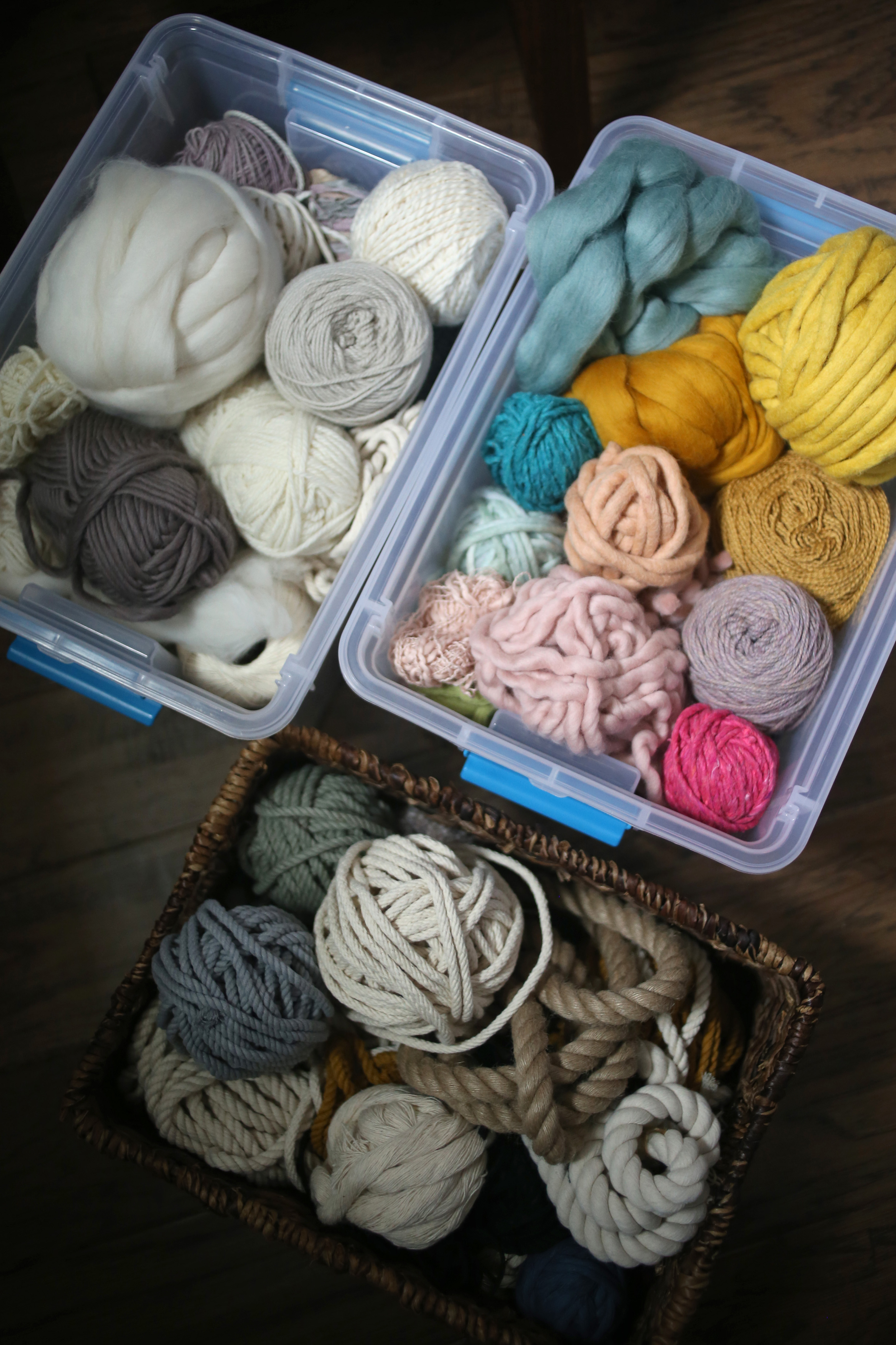 I use plastic bins and store them in cabinets around my house. I try to keep them organized by color; for example, I'll store the neutrals together, but sometimes I'll store them depending on the fiber (cotton rope, wool roving, etc.)
