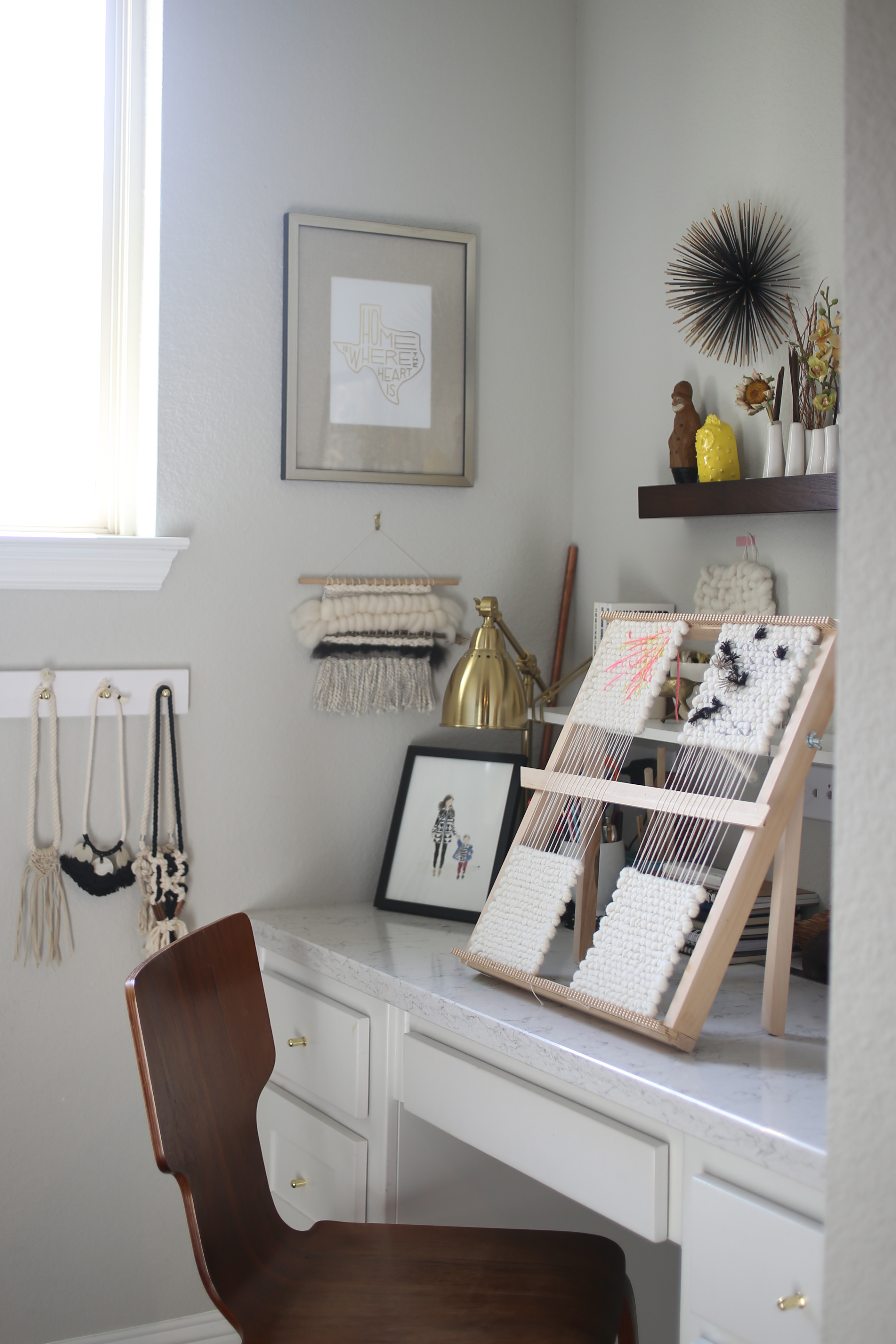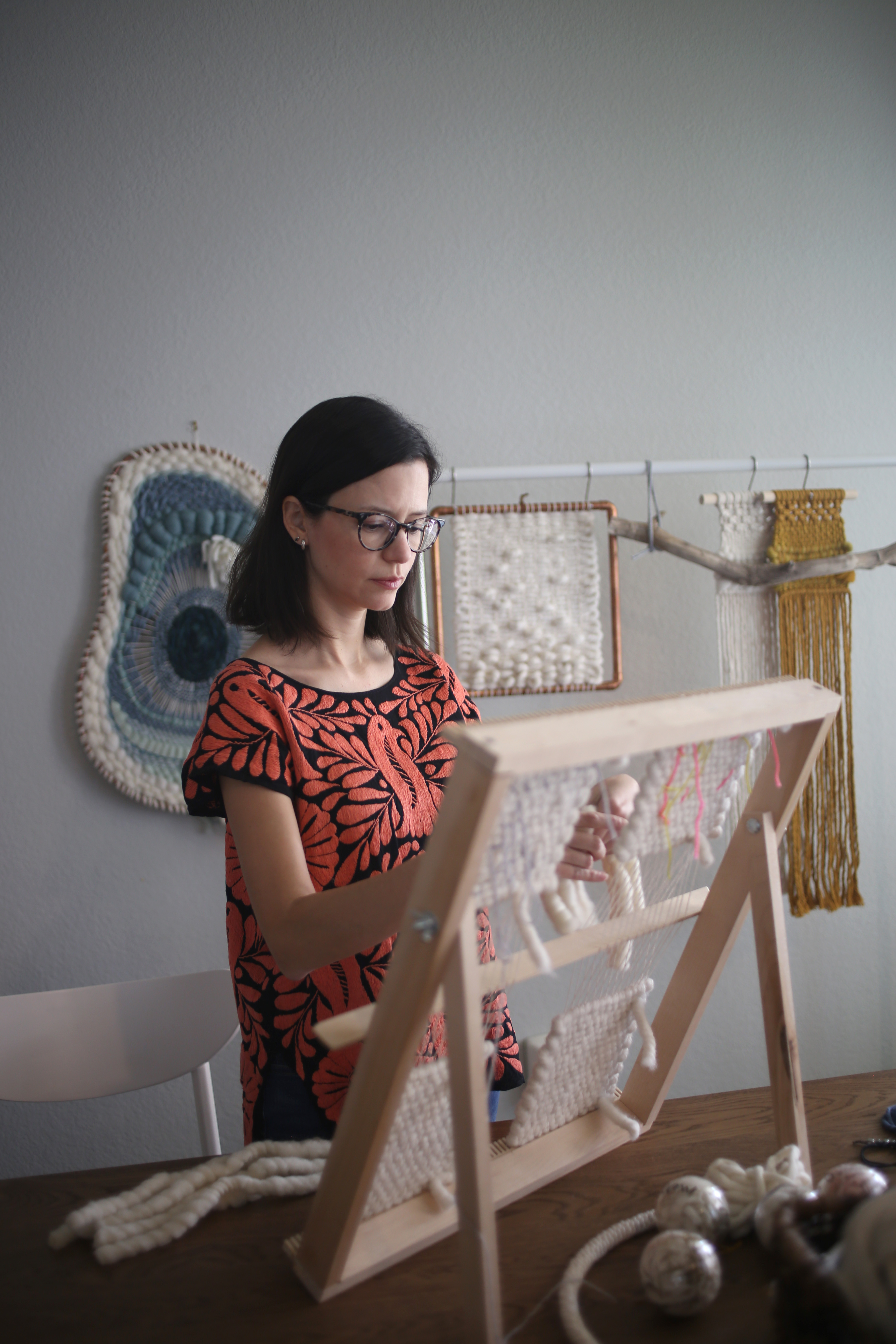 Cristina Ayala is a graphic designer and fiber artist. She grew up in Monterrey, Mexico, where she got a BA in Graphic Design from Universidad de Monterrey. After working for several years in local advertising agencies, together with her sister, they founded their own design firm "Stelier" in 2010. That same year, she moved to Dallas, TX. Four years later — while living on the East Coast — with her innate talent, creativity, and curiosity, she started learning weaving and knotting techniques. After discovering this new passion, she has been constantly creating unique pieces ranging from jewelry to wall art and installations, and also continues working on branding projects with her sister. She moved back to Dallas in 2015, where she currently resides with her family.