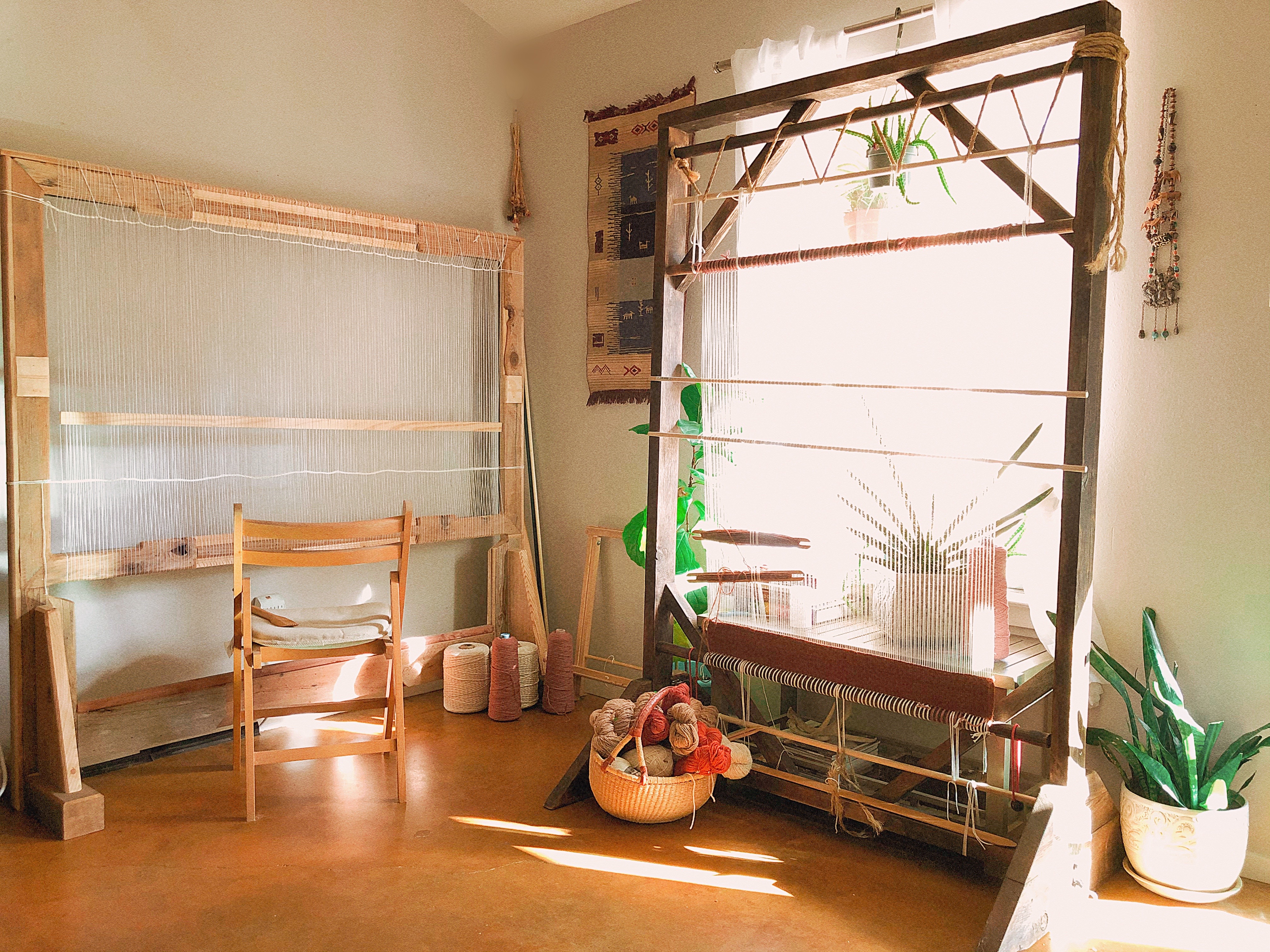 Yes and no. I have a room dedicated to my yarn storage and looms, but since the pandemic my husband had to move his office in there, so now we share that space. My floor loom is permanently in there next to my yarn, but to save space I had to move my larger tapestry looms to another room. So sometimes I work there if my project is on my floor loom. On a nice day I really love to work outside, and will move my tapestry looms to my backyard to weave.