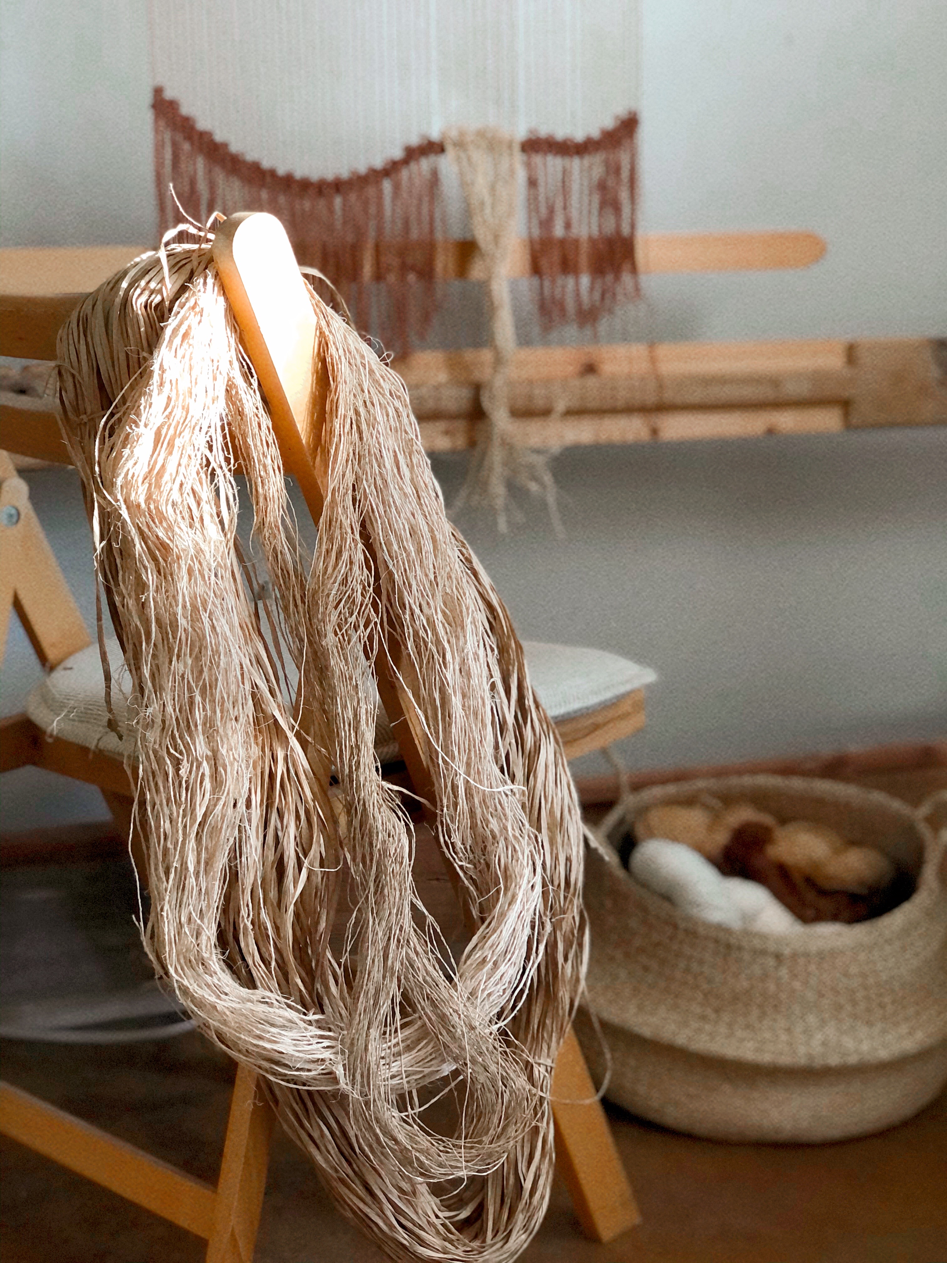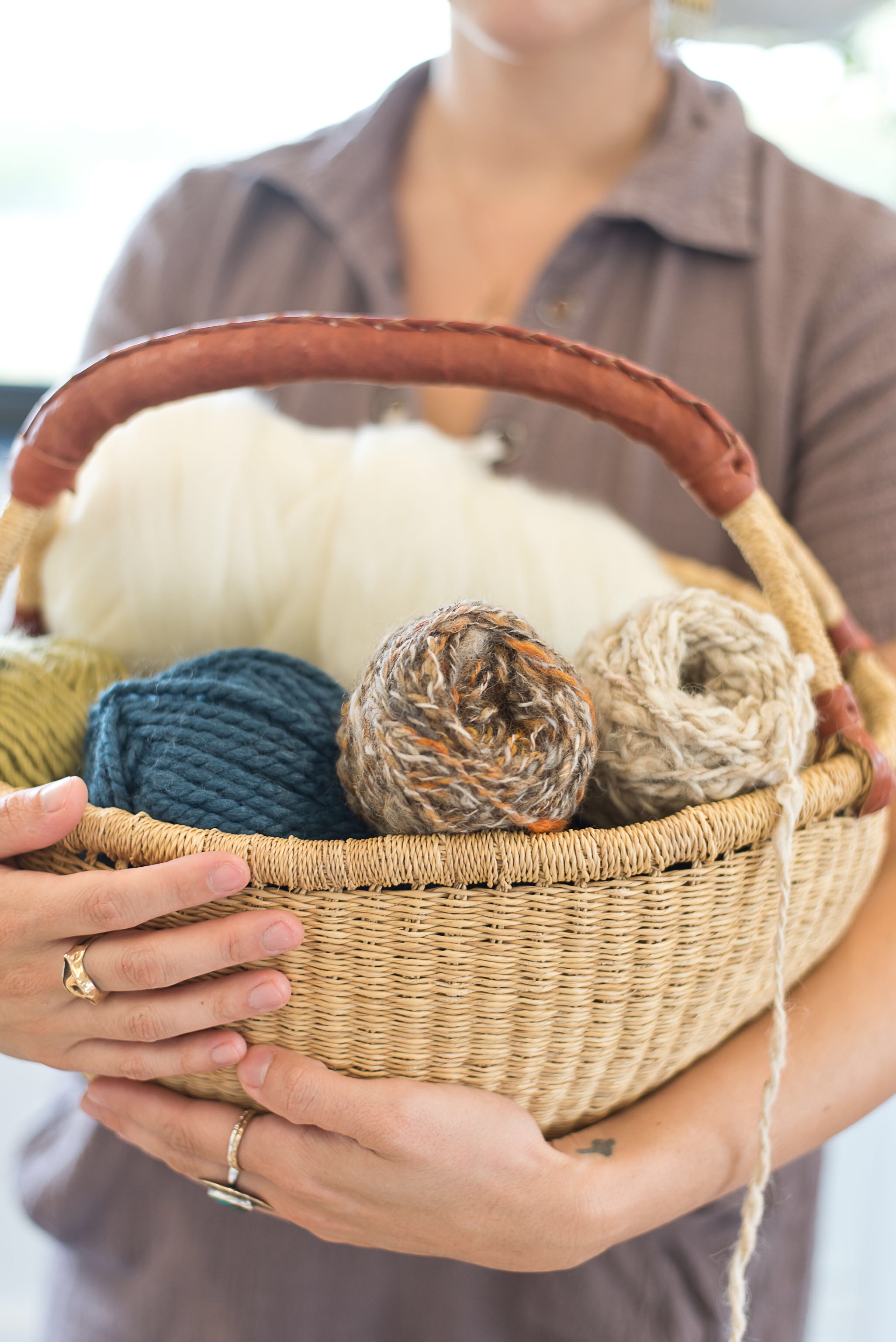 I like to carry whatever yarn I am currently using in little woven baskets; it's easy and portable for me to take wherever I am weaving.