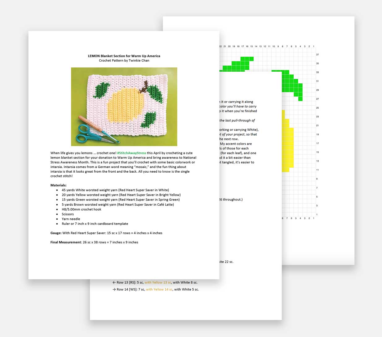 When life gives you lemons ... crochet one! #StitchAwayStress this April by crocheting a cute lemon blanket section. You can donate this section to Warm Up America! to help bring awareness to Stress Awareness Month. This is a fun project that you'll crochet with some basic colorwork or intarsia.