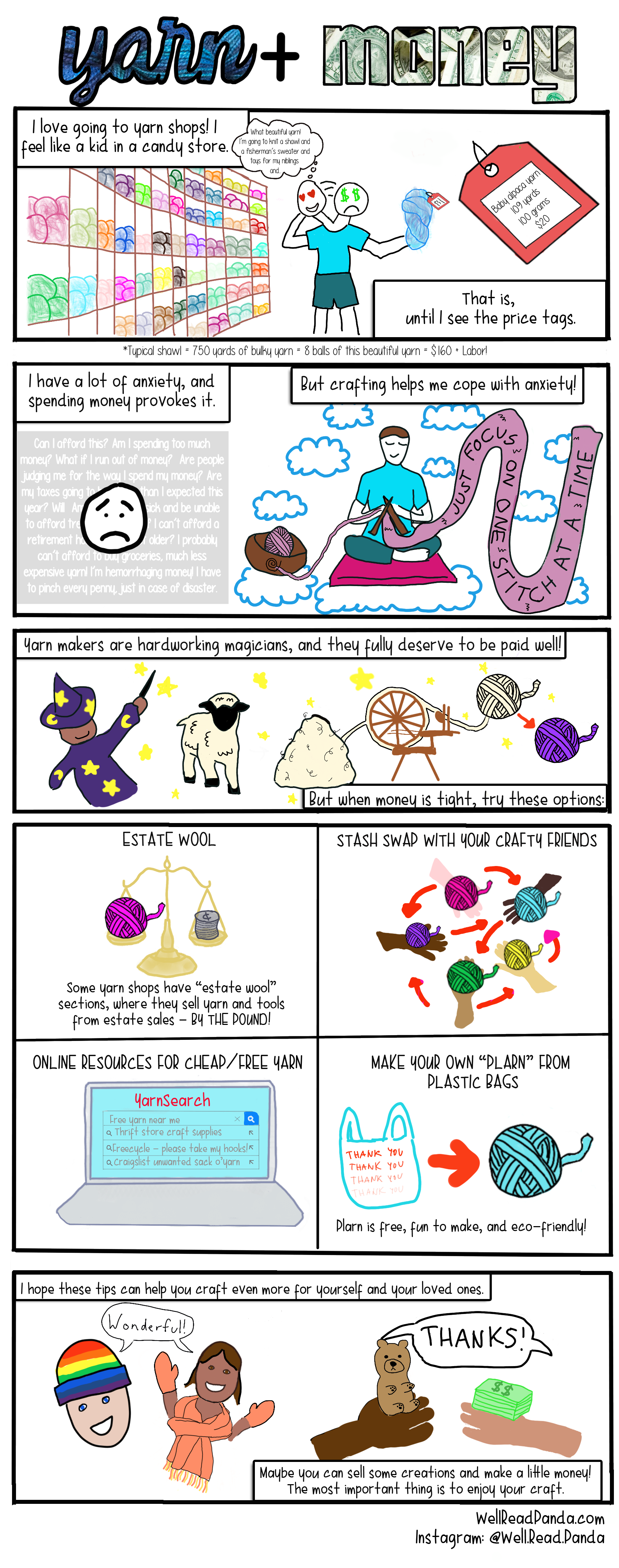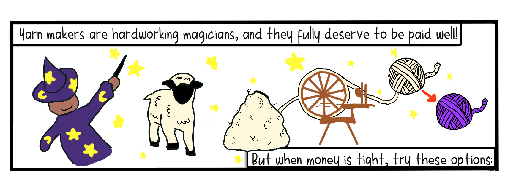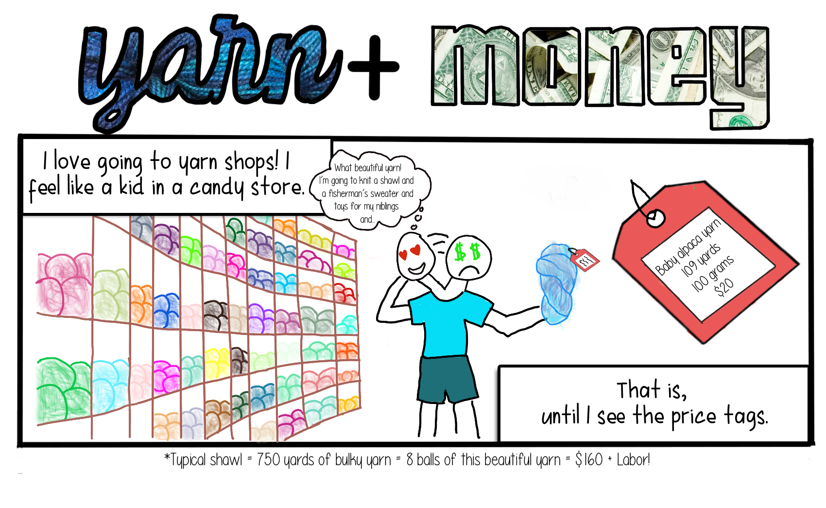 Kitty Quitmeyer is passionate about yarn crafting as an art and as a coping mechanism. She knits and crochets in the Panamanian rainforest, where she operates Digital Naturalism Laboratories with her partner, Andrew Quitmeyer. Continue reading for a comic about Kitty's thoughts on the intersection between yarn and money!